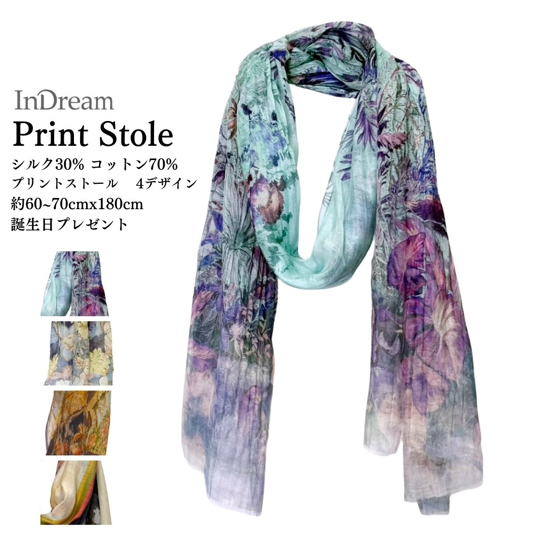 InDream シルクコットンストール ブルー ブラウン ネイビー プリント 結婚式 ストール 大判 パーティー 春 夏 秋 誕生...