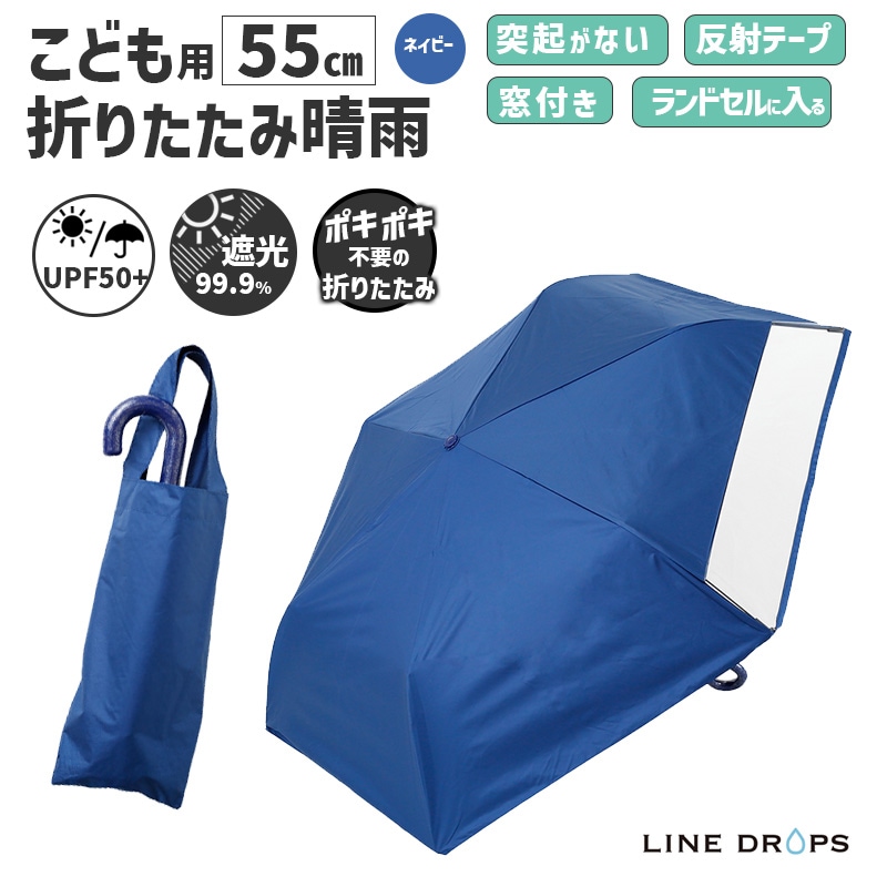 [54783] キッズ 折りたたみ傘 LINEDROPS 晴雨 55cm ネイビー 紺 透明窓 突起のない露先 反射テープ UVカ...