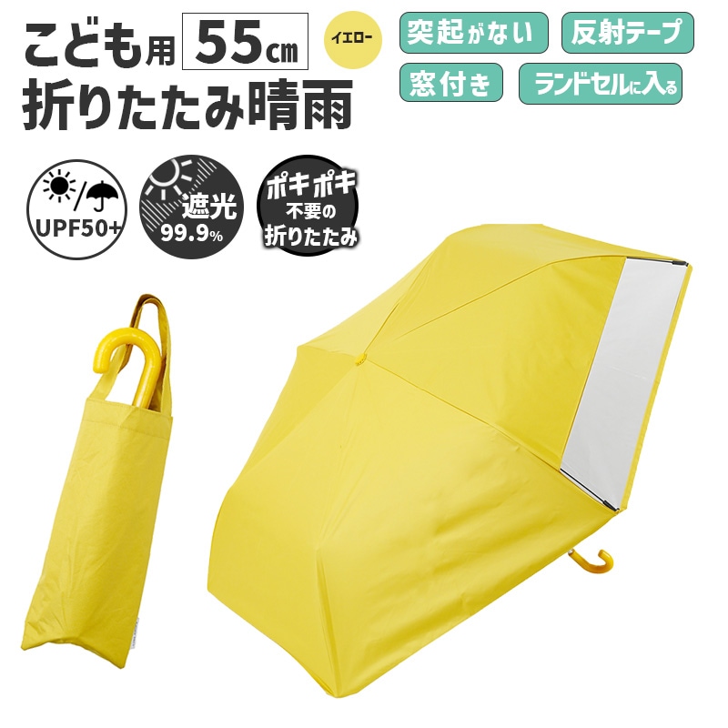 [54784] キッズ 折りたたみ傘 LINEDROPS 晴雨 55cm イエロー 黄色 透明窓 突起のない露先 反射テープ UV...