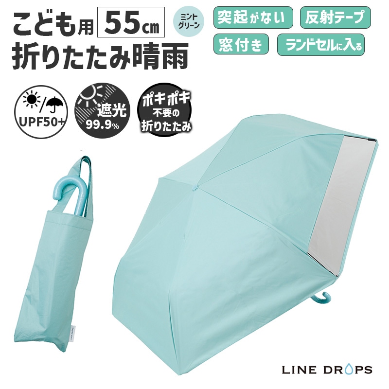 [54785] キッズ 折りたたみ傘 LINEDROPS 晴雨 55cm ミントグリーン 透明窓 突起のない露先 反射テープ UV...