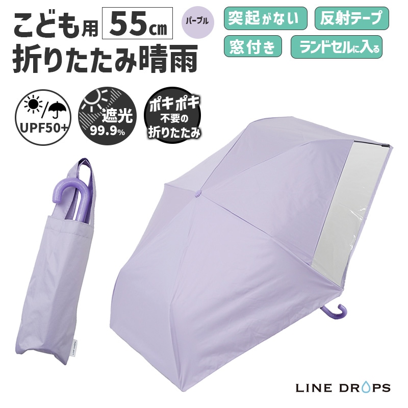 [54786] キッズ 折りたたみ傘 LINEDROPS 晴雨 55cm パープル 紫 透明窓 突起のない露先 反射テープ UVカ...