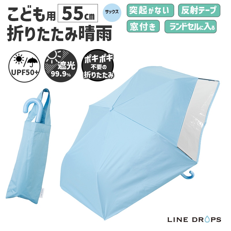 [54787] キッズ 折りたたみ傘 LINEDROPS 晴雨 55cm サックス 水色 透明窓 突起のない露先 反射テープ UV...