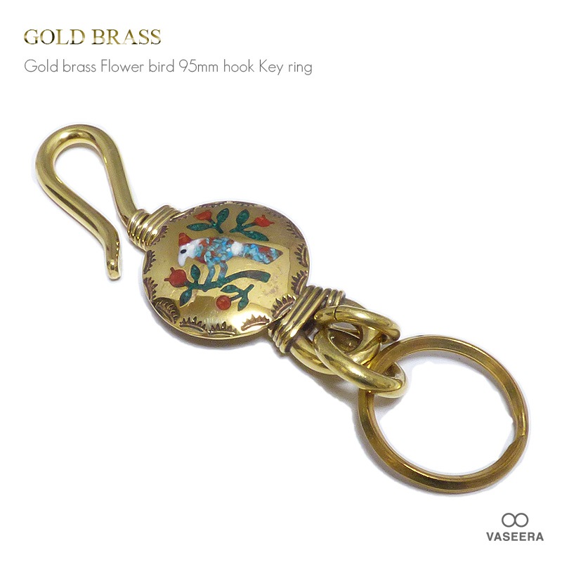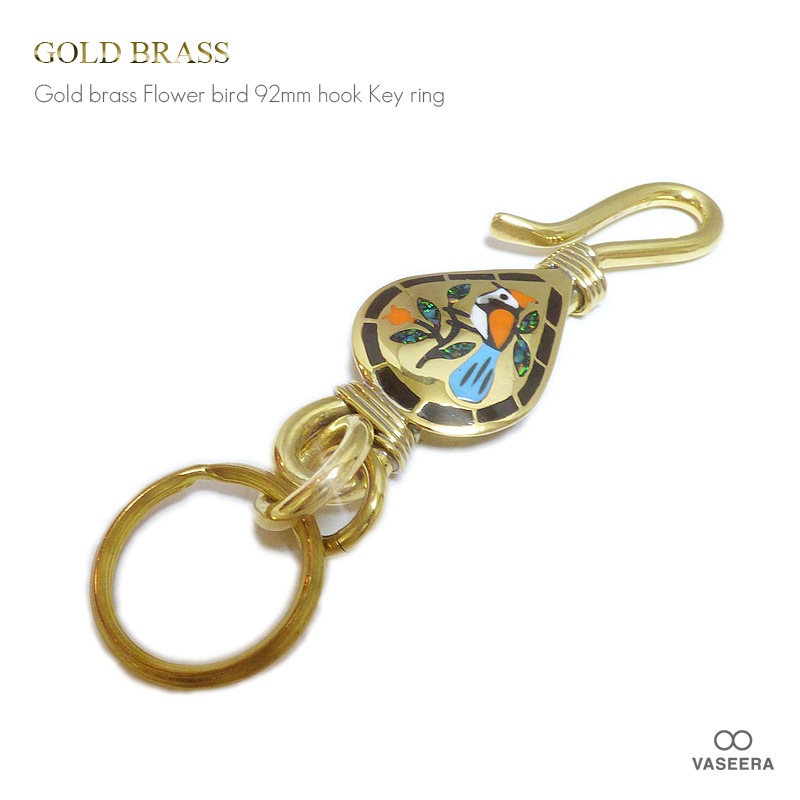 ゴールドブラス(真鍮) 92mm インレイ仕上げ ハミングバード(ハチドリ) ベルトフック 30mm二重カン付きキーホルダー 【...