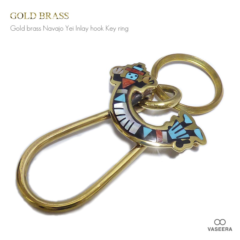 ゴールドブラス(真鍮) ナバホの精霊 天然石インレイ仕上げ 30mm二重カン付きキーホルダー 【キーリング 】