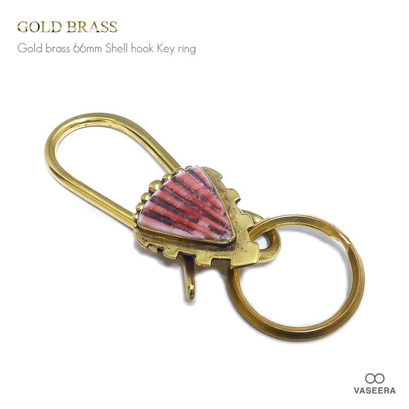 ゴールドブラス(真鍮) ピンクシェル ロック式フック 30mm二重カン付きキーホルダー 【キーリング 】