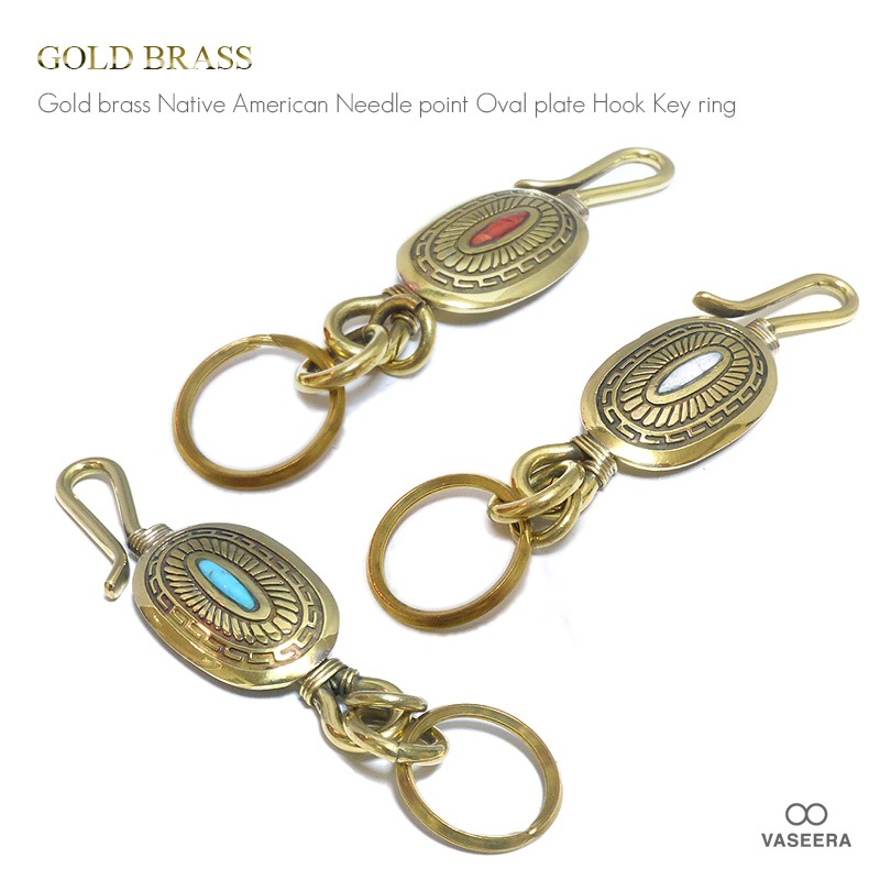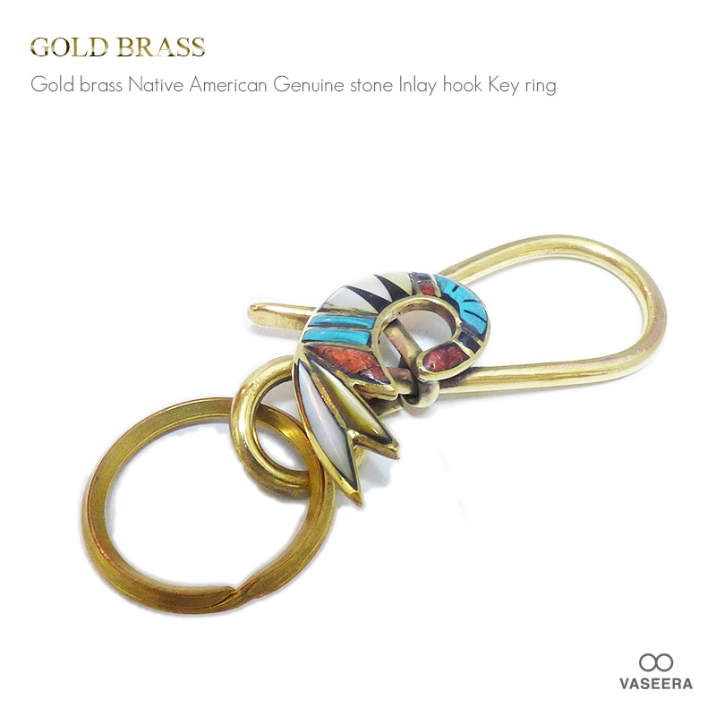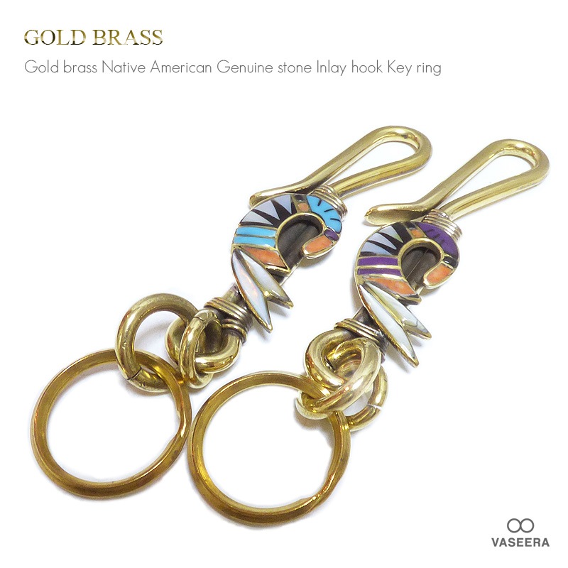 ゴールドブラス(真鍮) 106mm ネイティブアメリカン 天然石インレイ仕上げ ベルトフック 30mm二重カン付きキーホルダー...