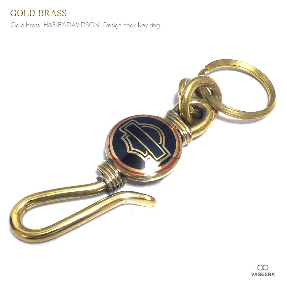 ゴールドブラス(真鍮) ハーレーダビッドソン(文字無し)デザイン フック 30mm二重カン付き キーホルダー 【キーリング 】
