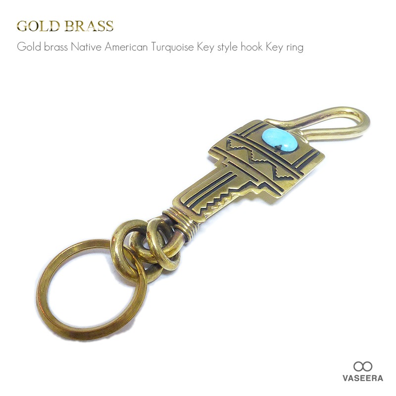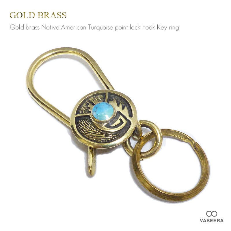 ゴールドブラス(真鍮) ターコイズ埋め込みネイティブアメリカンのシンボル 鍵型フック 30mm二重カン付きキーホルダー 【キーリ...