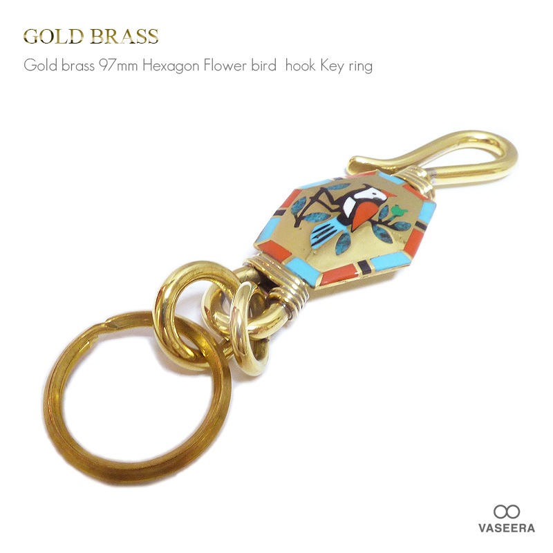 ゴールドブラス(真鍮) 97mm インレイ仕上げ 六角形型 ハミングバード(ハチドリ) ベルトフック 30mm二重カン付きキーホ...