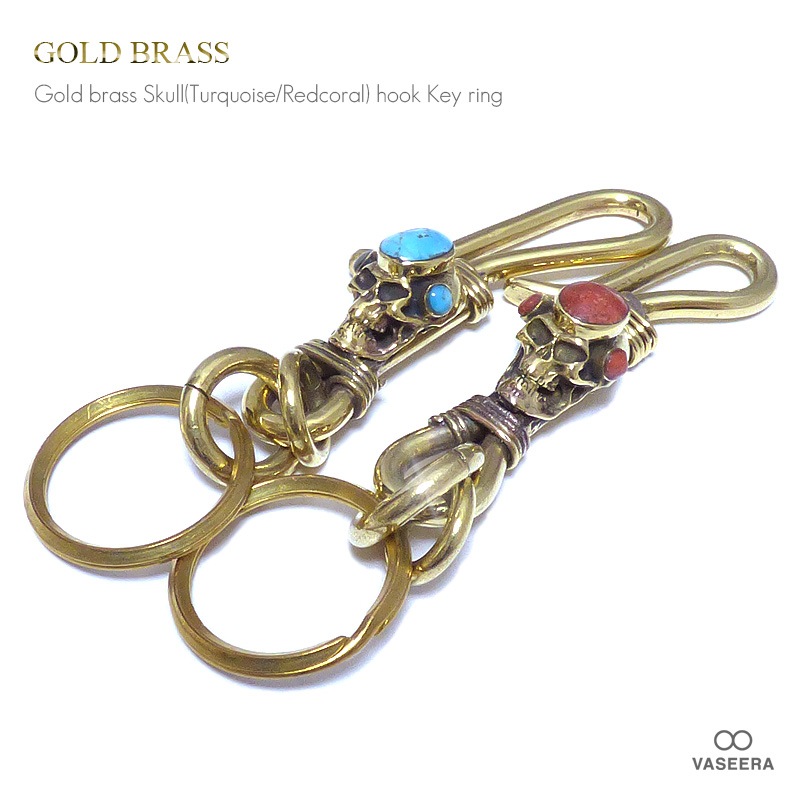 ゴールドブラス(真鍮) 天然石埋め込み(ターコイズ/レッドコーラル)スカル 30mm二重カン付きキーホルダー 【キーリング 】