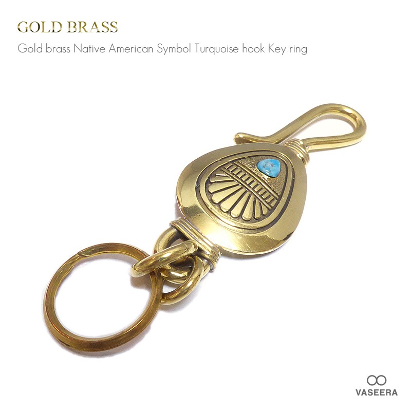 ゴールドブラス(真鍮) ネイティブアメリカンシンボル ターコイズ ベルトフック 30mm二重カン付きキーホルダー 【キーリング 】