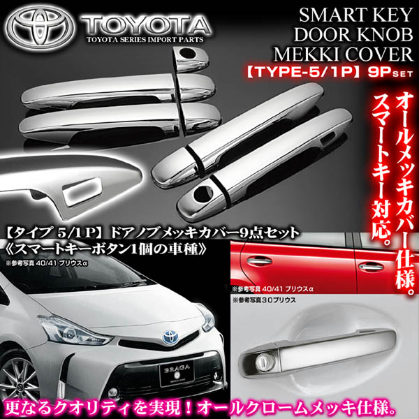トヨタ車・30/35プリウス【タイプ5/1P】メッキ ドアノブ/ハンドル カバー《スマートキーボタン1個用/9点セット》ブラガ