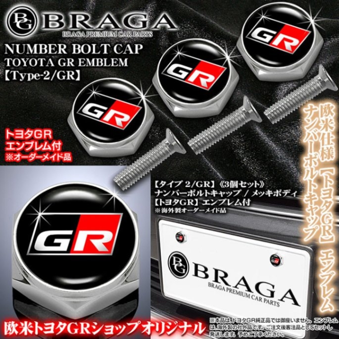 トヨタGR【GRエンブレム付/客注品】メッキボディ/ナンバーボルトキャップ《タイプ2/GR》3個セット[汎用品]欧米仕様/ブラガ