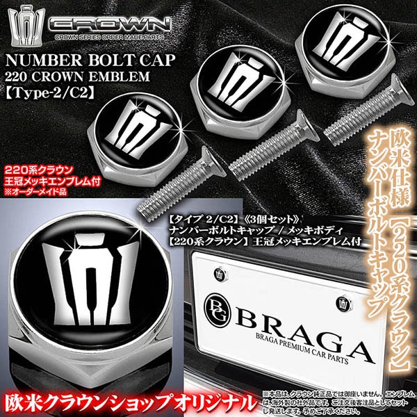欧米仕様【220系クラウン エンブレム付/客注品】メッキボディ/ナンバーボルトキャップ《タイプ2/C2》3個セット[汎用品]ブラガ