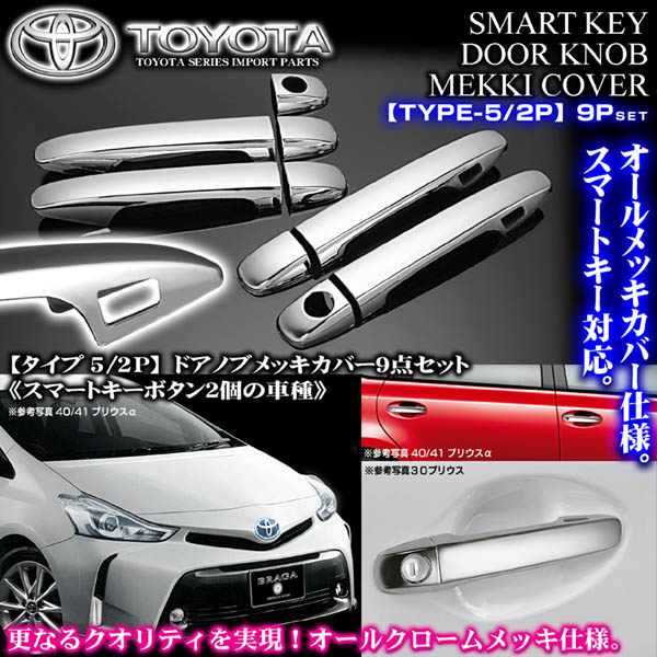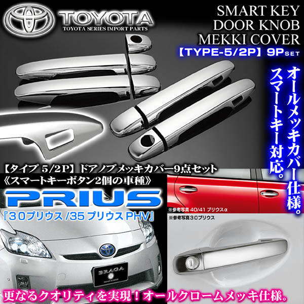 30プリウス【タイプ5/2P】メッキ ドアノブ/ハンドル カバー《スマートキーボタン2個用/9点セット》ブラガ