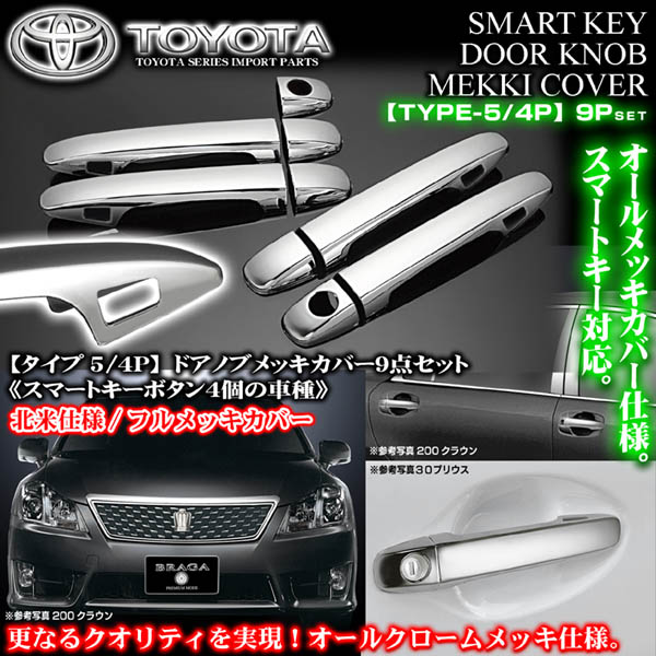 トヨタ/セダン車【タイプ5/4P】メッキ ドアノブ/ハンドル カバー《スマートキーボタン4個用/9点セット》ブラガ