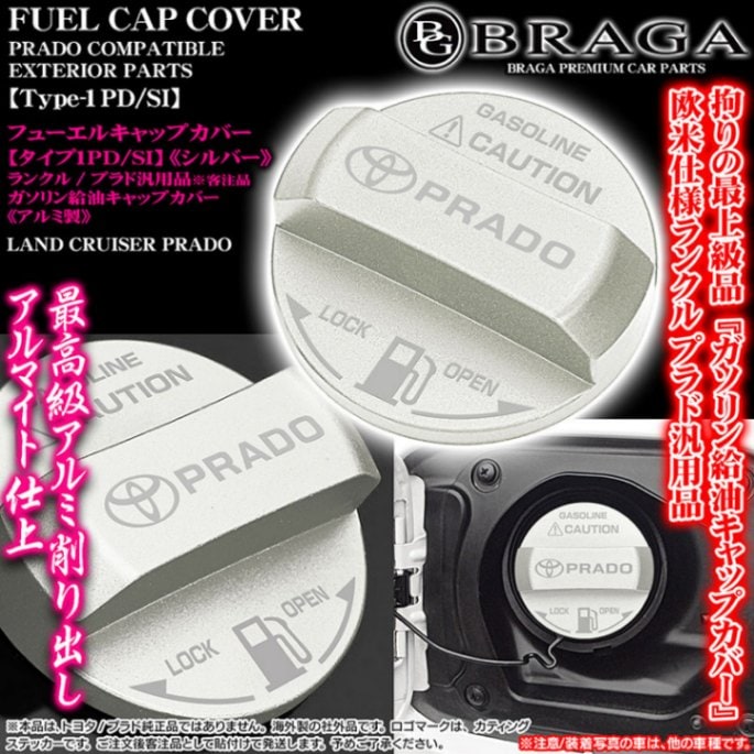 [タイプ1PD/SI]ランクル/プラド ガソリン給油フューエル キャップ カバー[アルミ/シルバー]PRADO & Tマークステッ...
