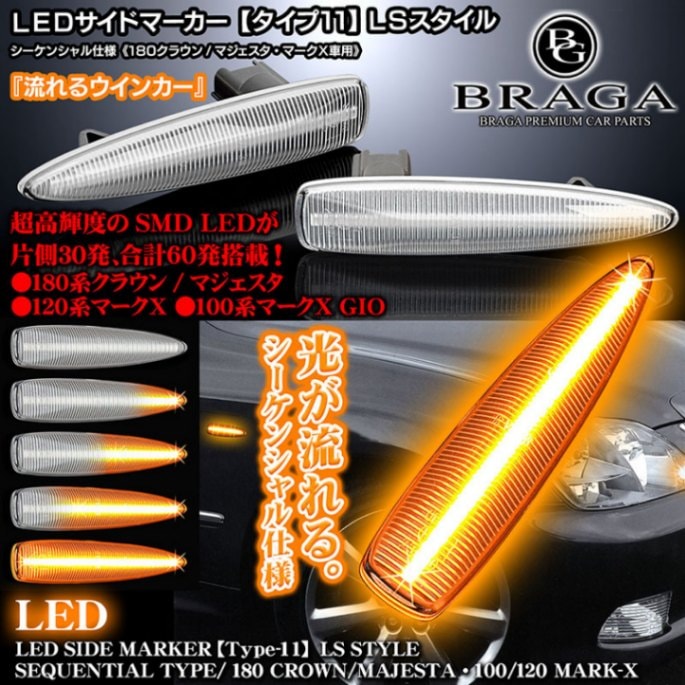 【タイプ11】流れるLEDサイドマーカー/LSスタイル《180クラウン/180マジェスタ》シーケンシャル ウインカー/クリアレンズ...