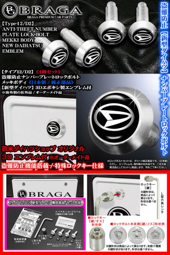 [タイプ12/D2]4個入 新型ダイハツ 3Dエンブレム付 海外社外品 客注品 盗難防止 ナンバープレート ロックボルト 純正品 ...