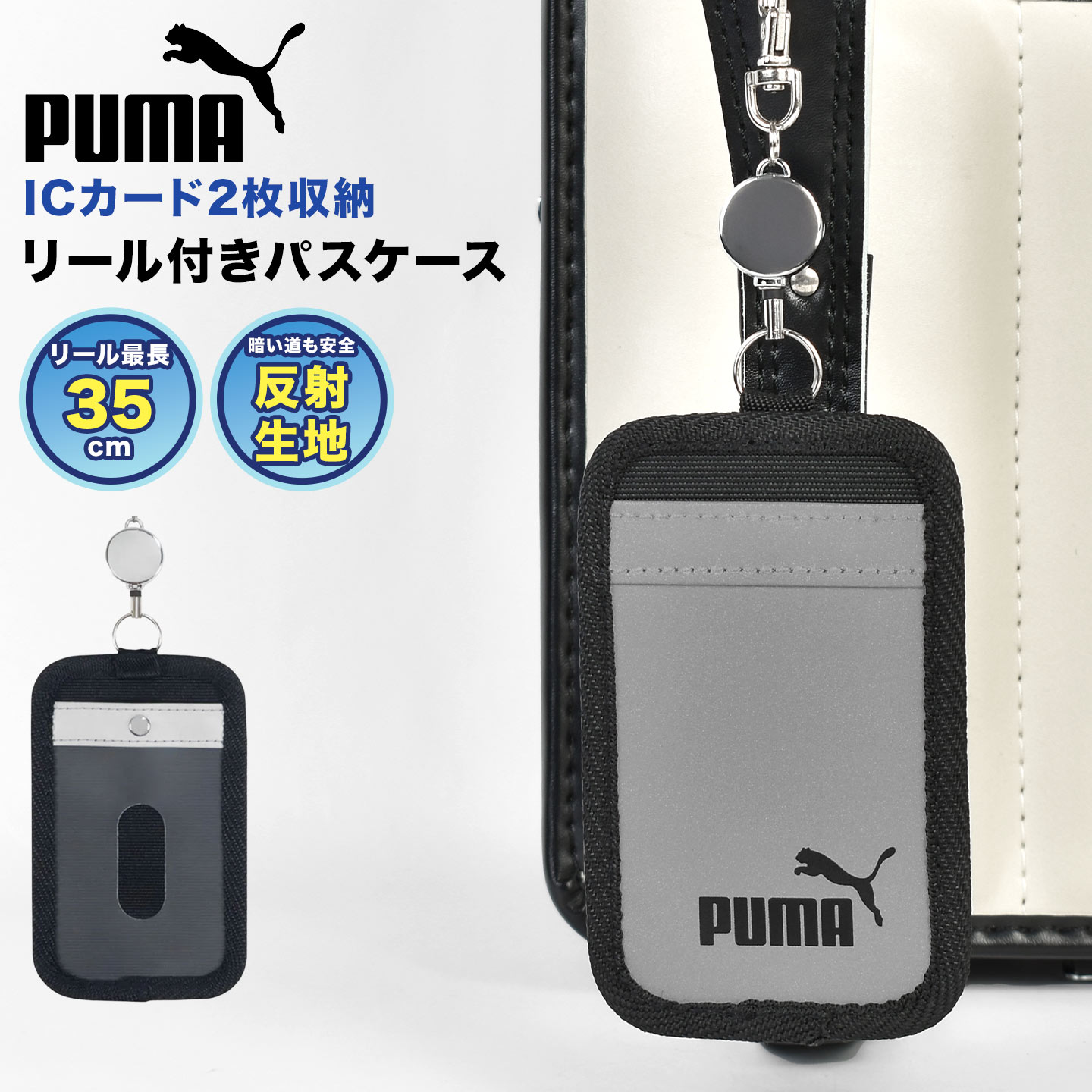 PUMA プーマ リール付き パスケース 定期入れ ICカード 2枚 収納可能 両面 リフレクター 反射板 伸びる 定期券ケース ...