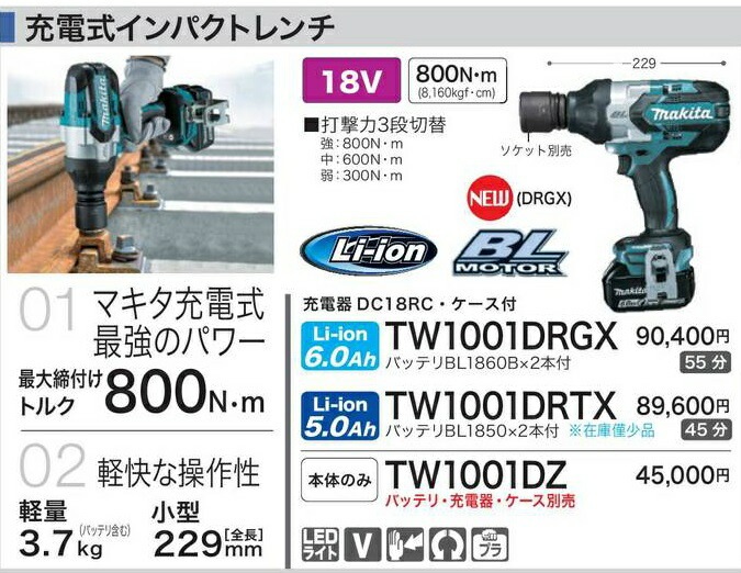 DIY女子も必見[税込新品]マキタ18V充電式インパクトレンチTW1001DRGX充電器・6.0Ahバッテリ・ケース付】 マキタ ...