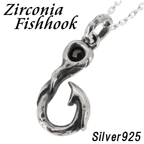 フィッシュフック ブラックジルコニア シルバー ネックレス チェーン付きペンダントトップ シルバー925 メンズ 釣り針 ハード ...