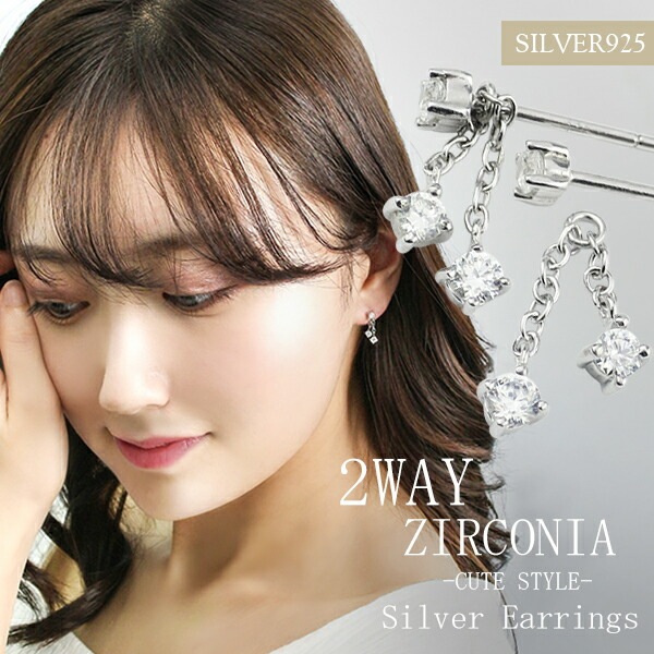チェーン&トリプルジルコニア シルバーピアス 2P 両耳 オシャレ かわいい 可愛い ギフトBOX