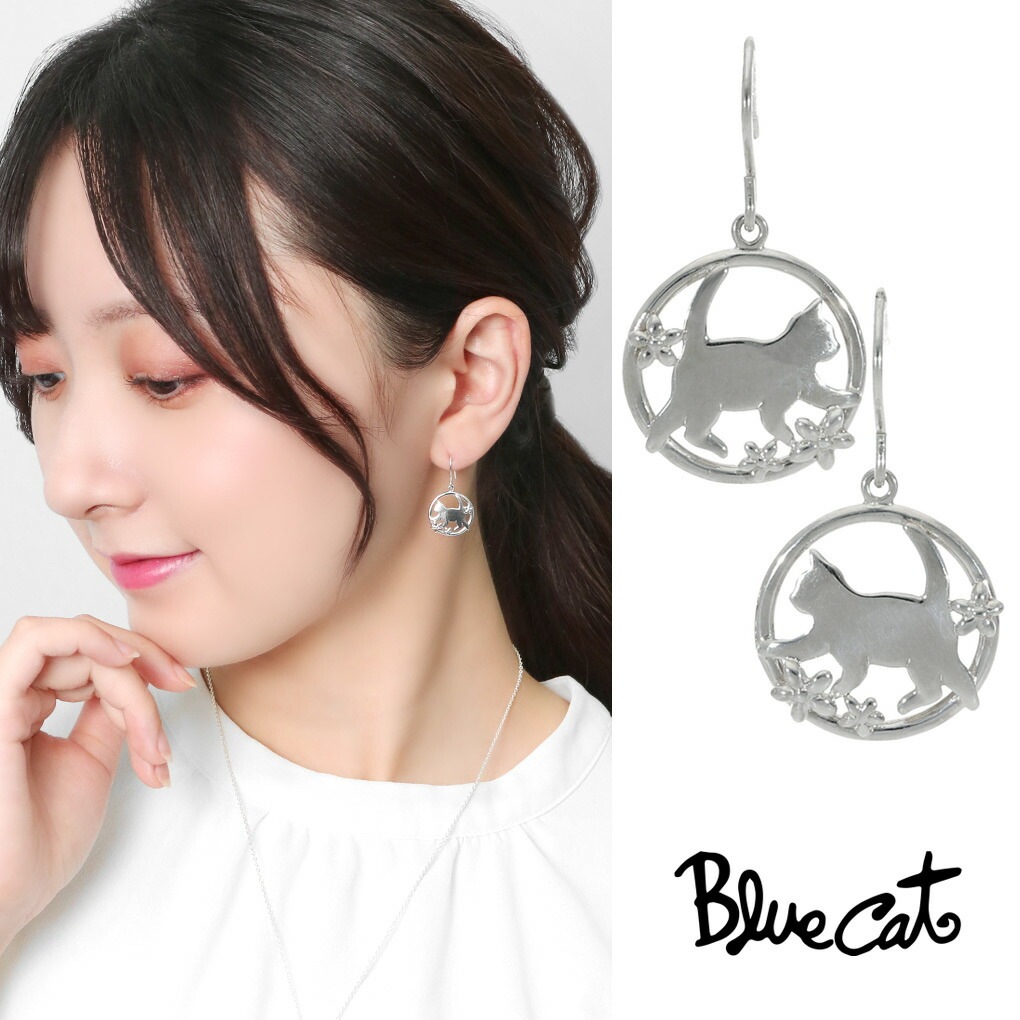 Blue Cat 猫 花 揺れる ピアス 2P 両耳用 フックピアス シルバー925 ねこ ネコ キャット 猫好き フラワー 透か...