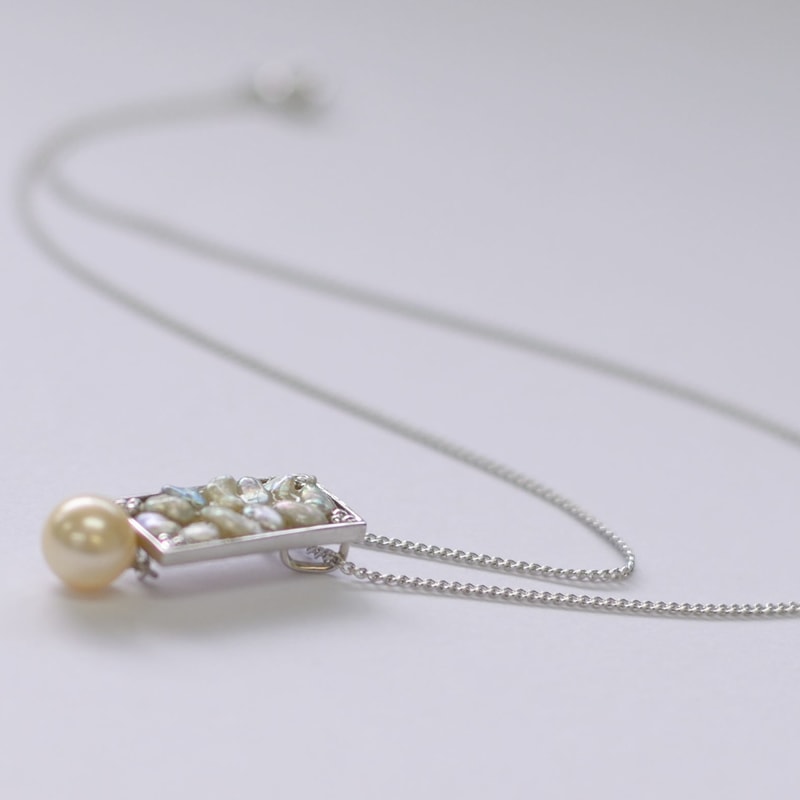 オリジナルあこやケシとイエローパールの四角モチーフのペンダント【あこや真珠】silver925製