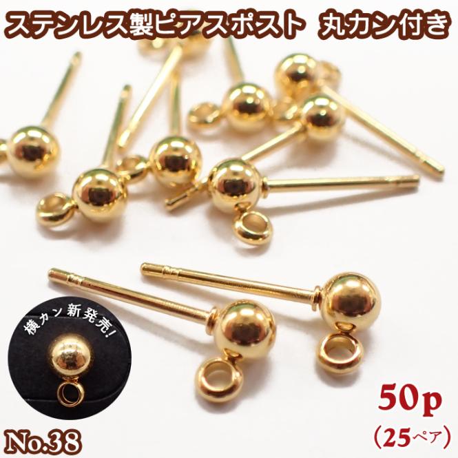 ピアス パーツ サージカルステンレス製 ピアスポスト カン付き ゴールド 【38】【50個売り】3mm/ 4mm 丸玉 カン付 ス...