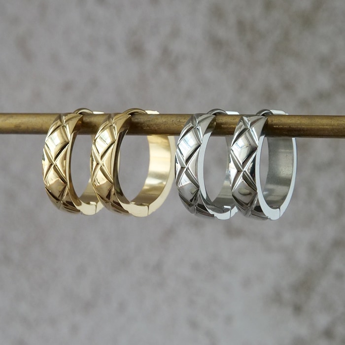 金属アレルギー対応 ステンレス ピアス 【179.キルティング柄 フープピアス 1ペア】 ゴールド シルバー キャッチレス シンプ...