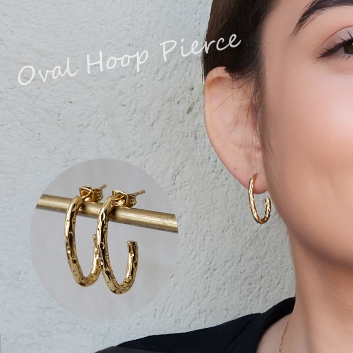 金属アレルギー対応 ステンレス ピアス 【178.槌目風 オーバル フープピアス 1ペア】マット キャッチレス シンプル 国内発送...