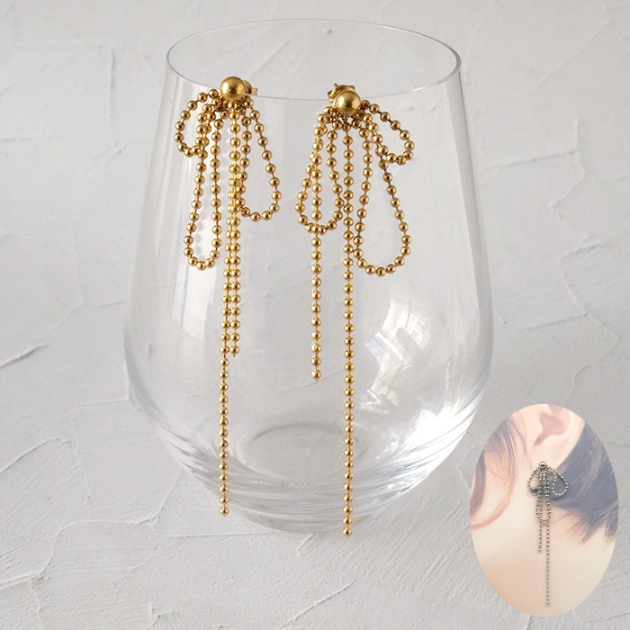 金属アレルギー対応 サージカルステンレス 【176. ボールチェーン リボン ロングピアス】 ゴールド シルバー スタッド メール...