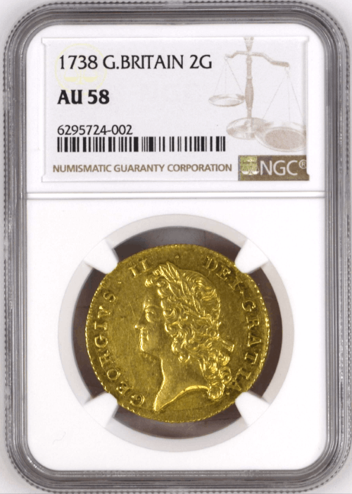 【動画あり】グレートブリテン 1738年 ジョージ2世 2ギニー金貨 NGC-AU58