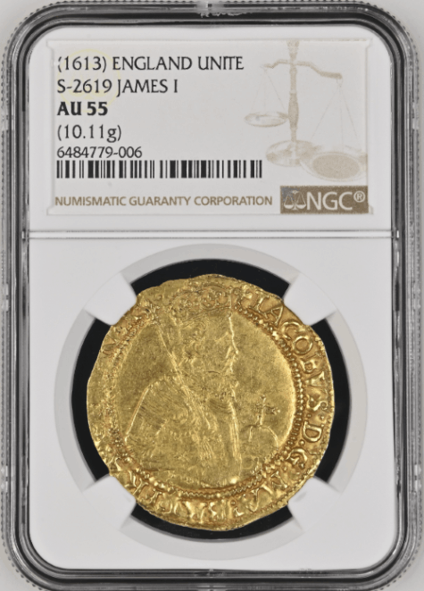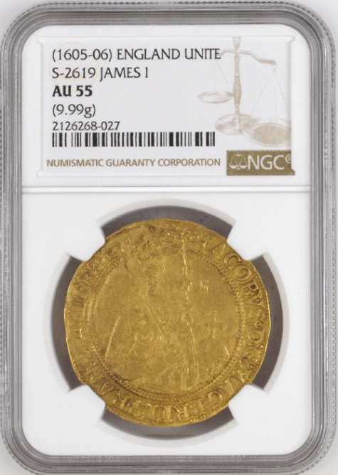 【動画あり】グレートブリテン 1605-06年 ジェームズ1世 ゴールド・ユナイト金貨 NGC-AU55