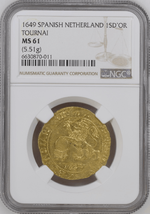 【動画あり】ベルギー トゥルネー 1649年 フェリペ4世 1ライオンドール金貨 NGC-MS61