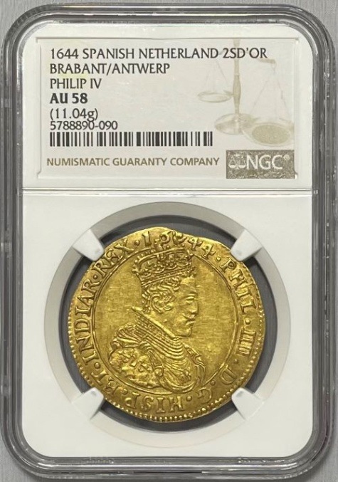 【動画あり】スパニッシュ・ネザーランド・ブラバント アントワープ 1644年 フェリペ4世 2ソブリンドール金貨 NGC-AU58