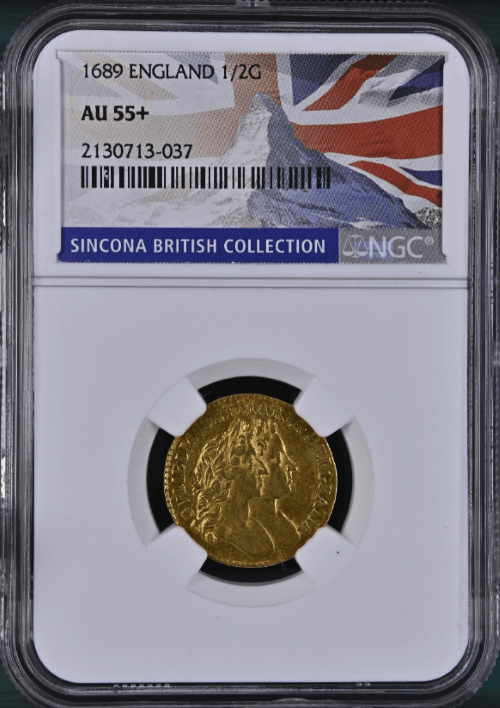 【動画あり】【レア度1-R1】グレートブリテン 1689年 ウイリアム3世&メアリー2世 1/2ギニー金貨 NGC-AU55+