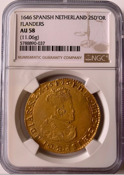 スパニッシュ・ネザーランド フランドル 1646年 フェリペ4世 2ソブリンドール金貨 NGC-AU58