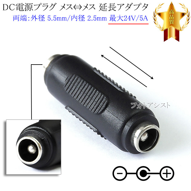 DC電源プラグ⇔DC電源プラグ 延長アダプタ メス⇔メス 外径 5.5mm/内径 2.5mm 最大24V/5A