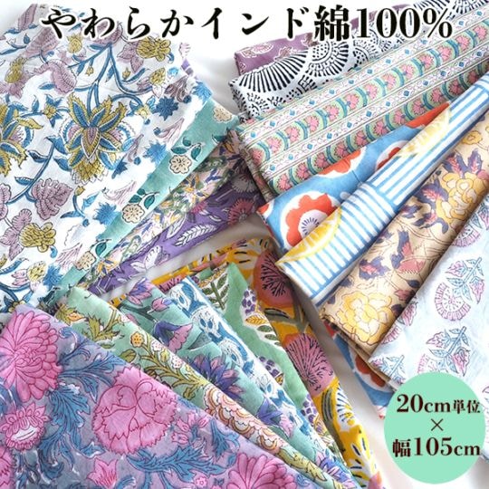 110cm幅 やわらかインド綿 花柄プリント生地 ブロックプリント コットン100% カーテン生地 クッション ハンカチ 営業日即...