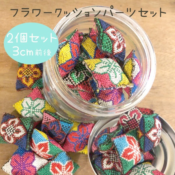 2個セット モン族クロスステッチ刺繍花柄クッションパーツ ポンポンモチーフ アクセサリーパーツ てしごと チェンマイ雑貨 針刺し針...