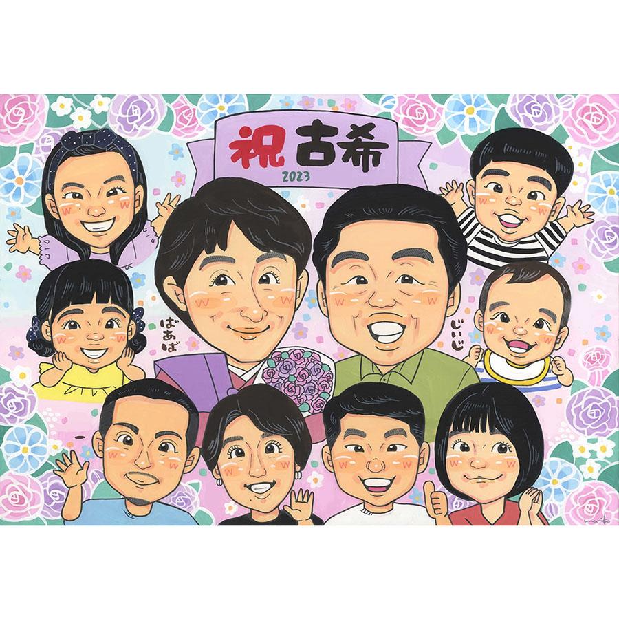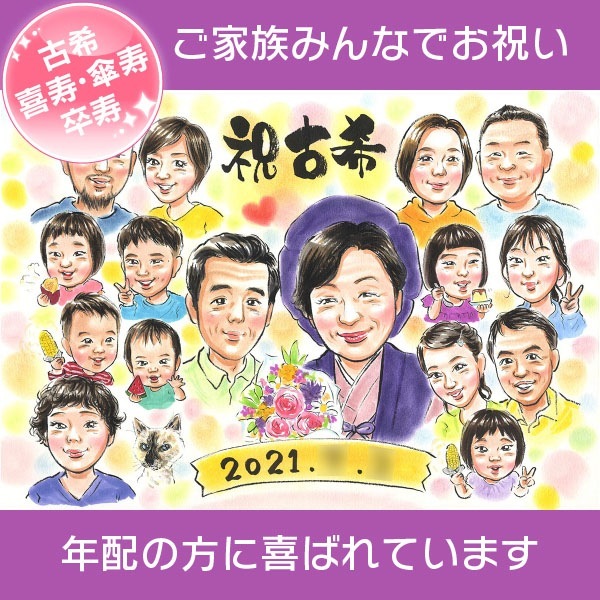 古希 似顔絵 プレゼント 両親 家族集合 記念ギフト 手描き 名前入り メッセージ付き お祝い 贈り物 孫からの贈り物 笑顔の似顔...