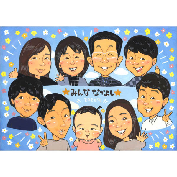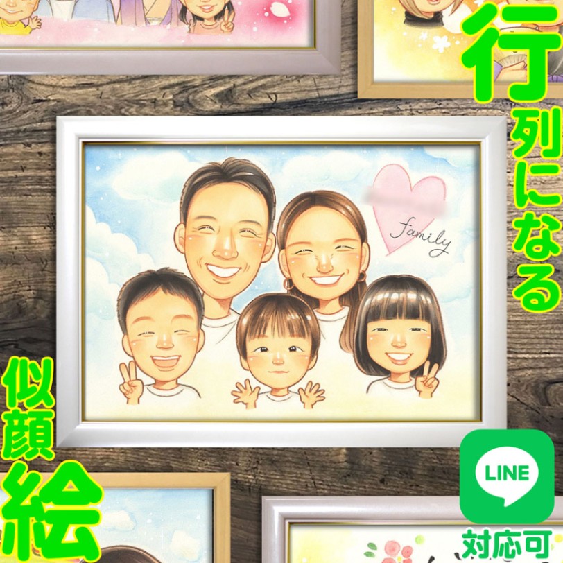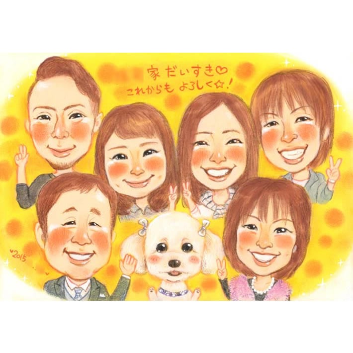 家族の絆をカタチに!お祝いにぴったりの大人数似顔絵ギフト 家族全員の似顔絵が描かれた特別なギフト。写真から描かれた似顔絵なので、大...