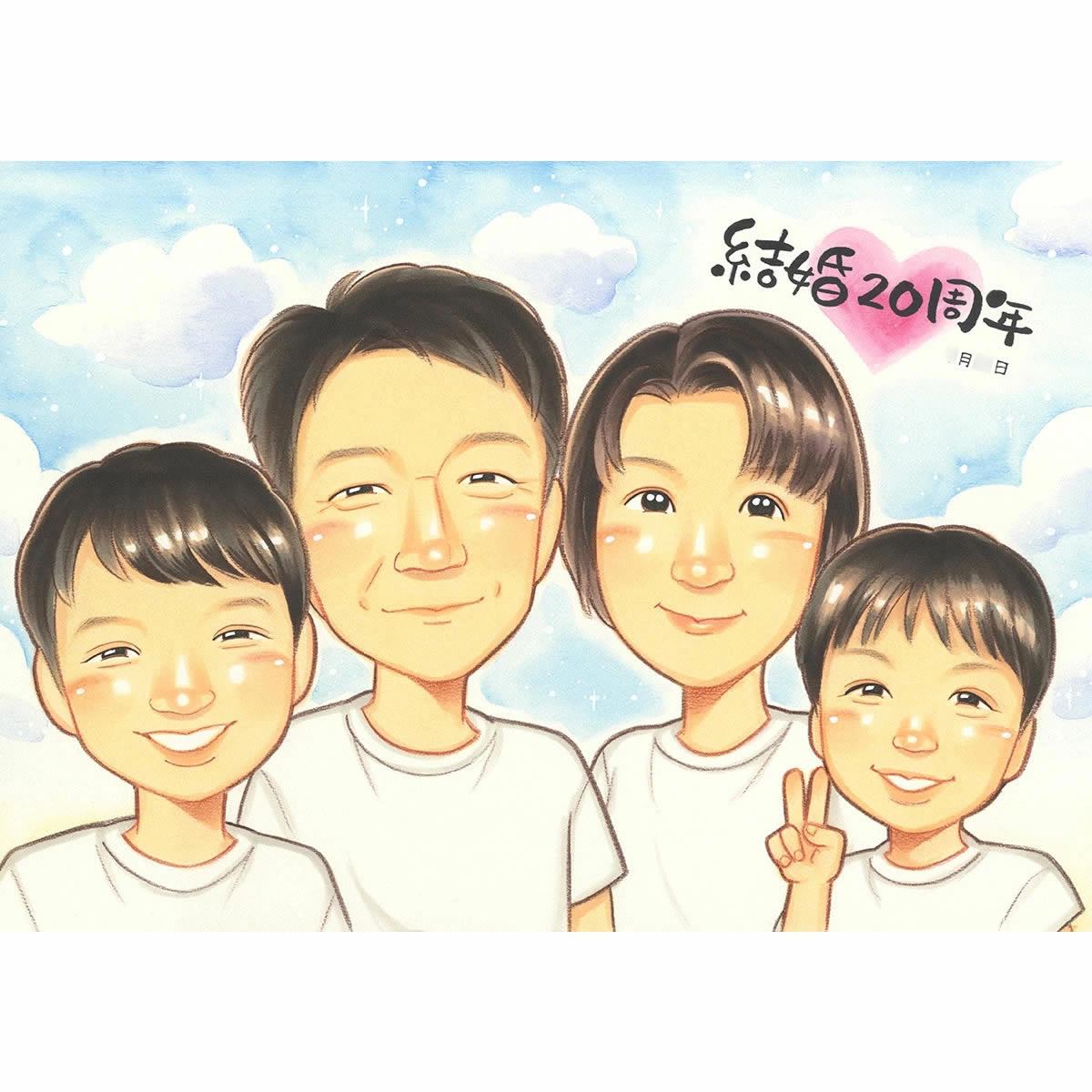 記念日に飾りたくなる、爽やかな家族似顔絵を 結婚10周年から50周年まで対応。カップルや夫婦に贈る、おしゃれな家族似顔絵ギフト い...