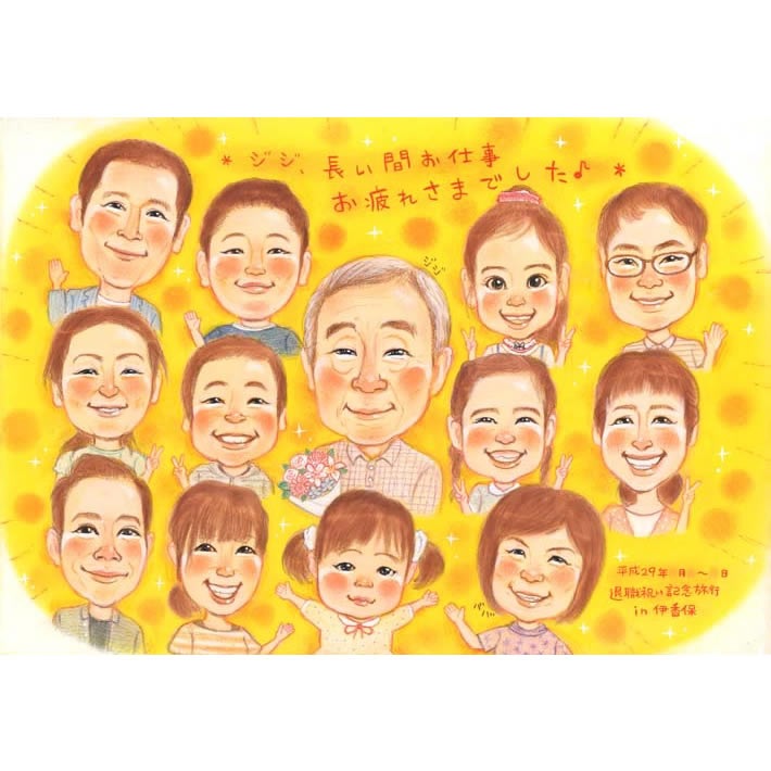 案1: 感謝の気持ちを形にする退職ギフト 写真から描くカラフル似顔絵 定年退職や転職でお父さんが感じる複雑な気持ちを、家族で贈る似...