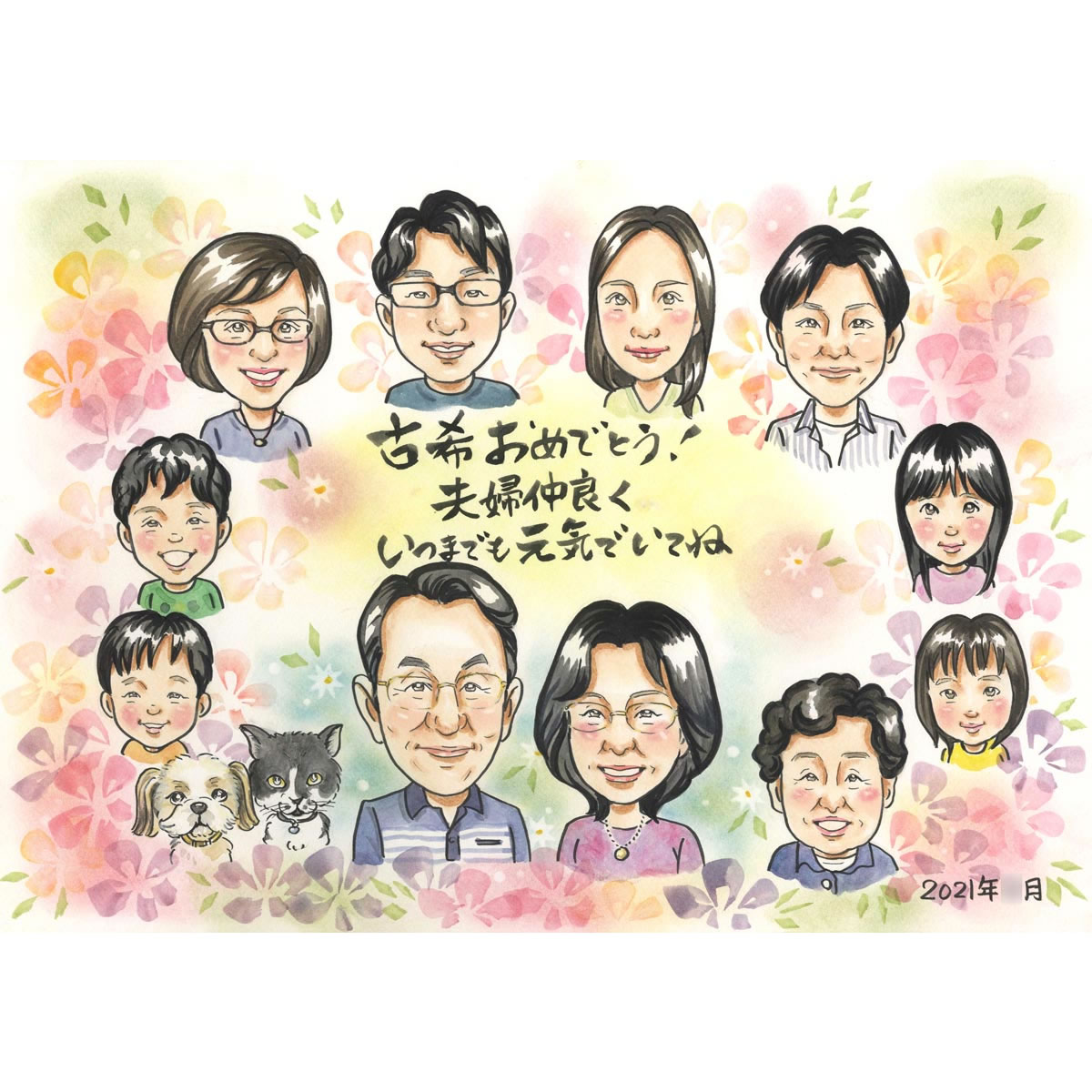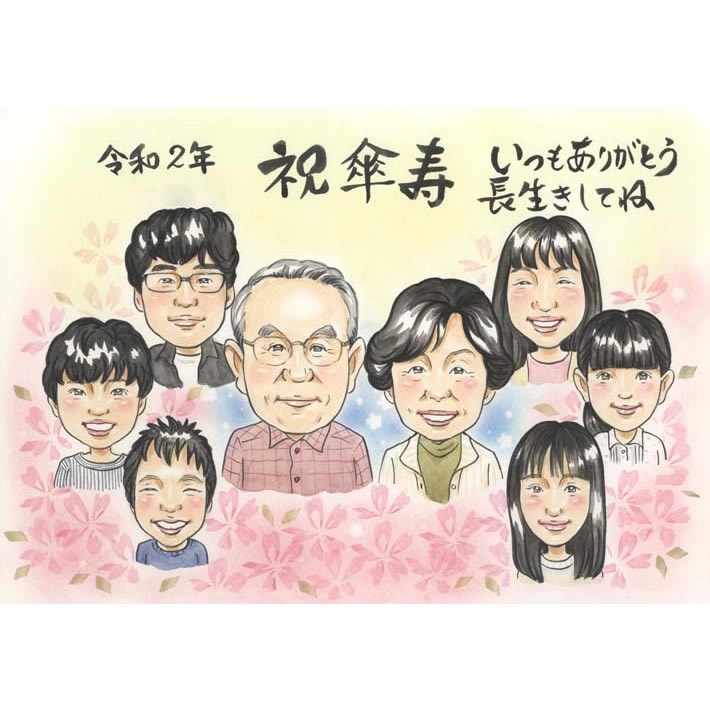 80歳のおばあちゃん、おじいちゃんへの感謝を伝える傘寿似顔絵ギフト 80歳傘寿祝いの思い出に!家族と一緒の似顔絵ギフト