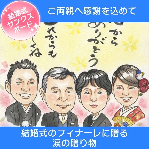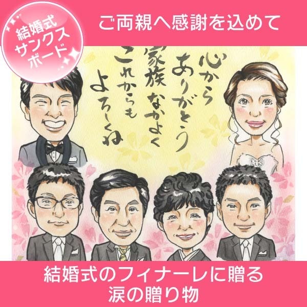 家族揃ってのウェディング感謝サンクスボード お礼の気持ちを伝えよう ウェディングの感謝の似顔絵サンクスボード 家族みんなでお祝い