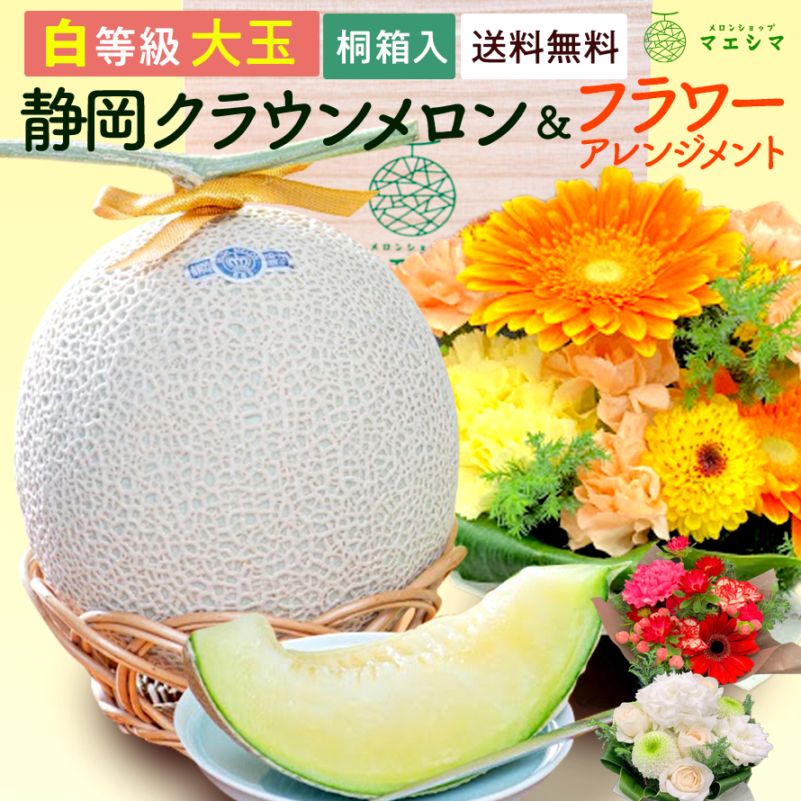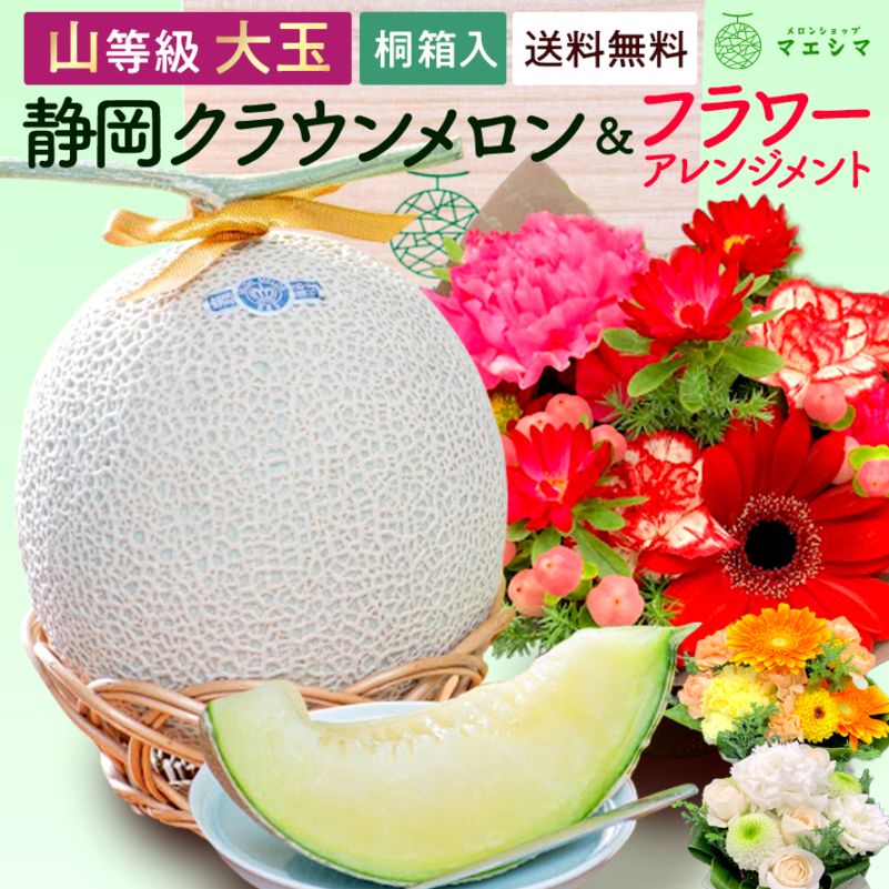 クラウンメロン+フラワーアレンジメントセット 【上(山等級)】中玉(1.3kg前後)1玉入り