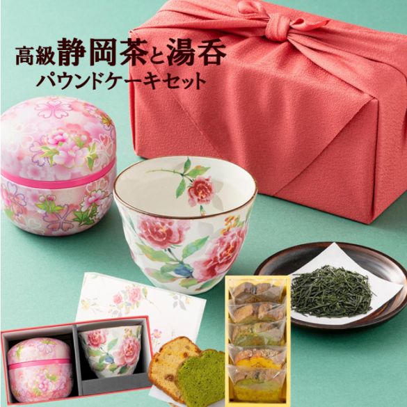 ギフト お茶 自家製パウンド5個と湯呑みと静岡茶のセット 新茶と美濃焼湯呑みと自家製パウンドのセット 丸茶缶 風呂敷ラッピング付 ...
